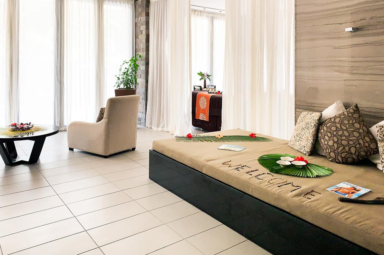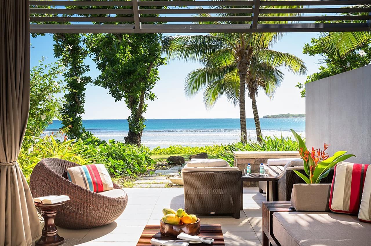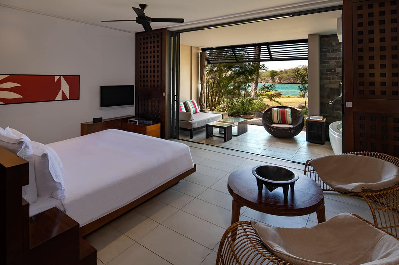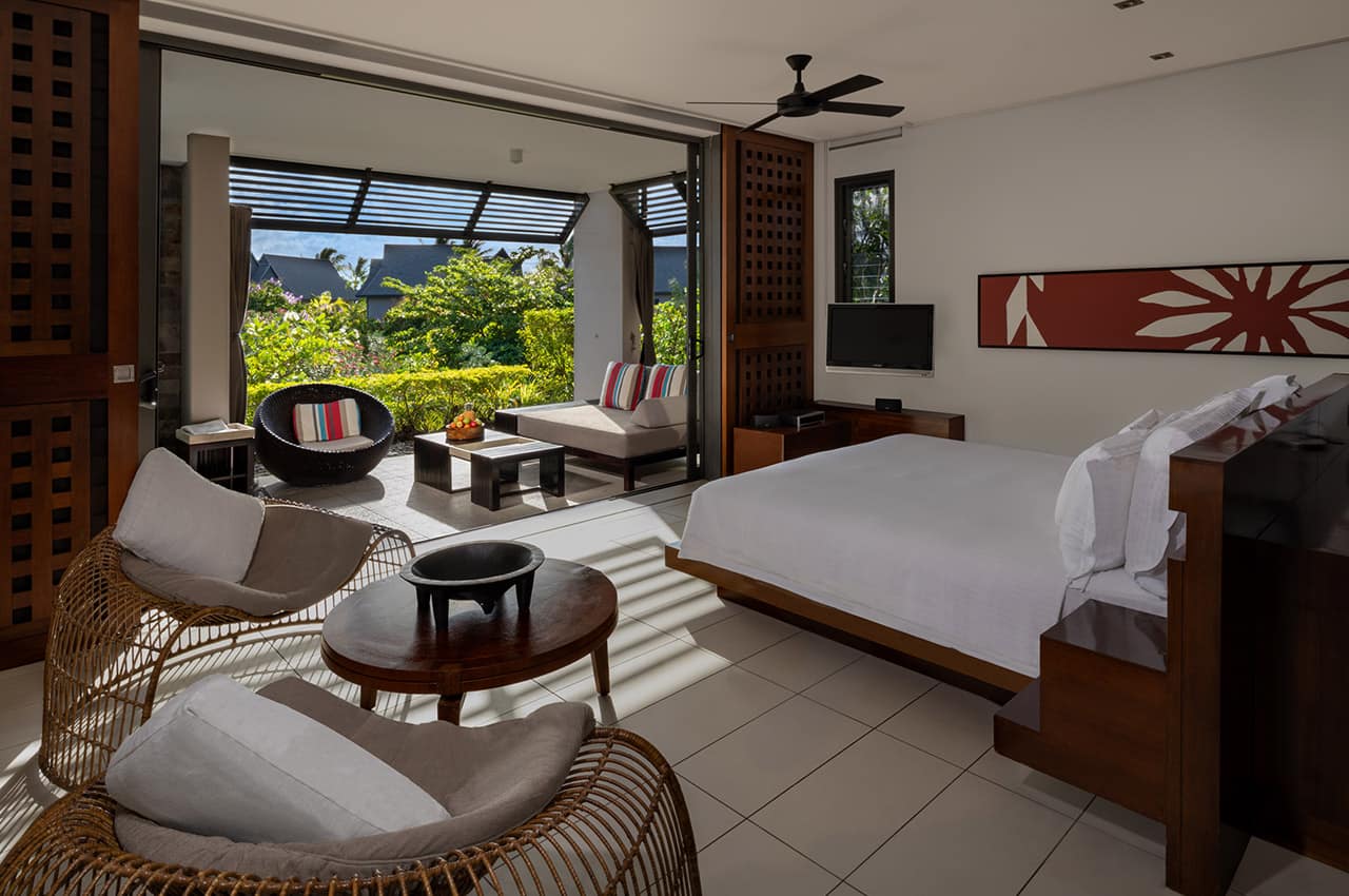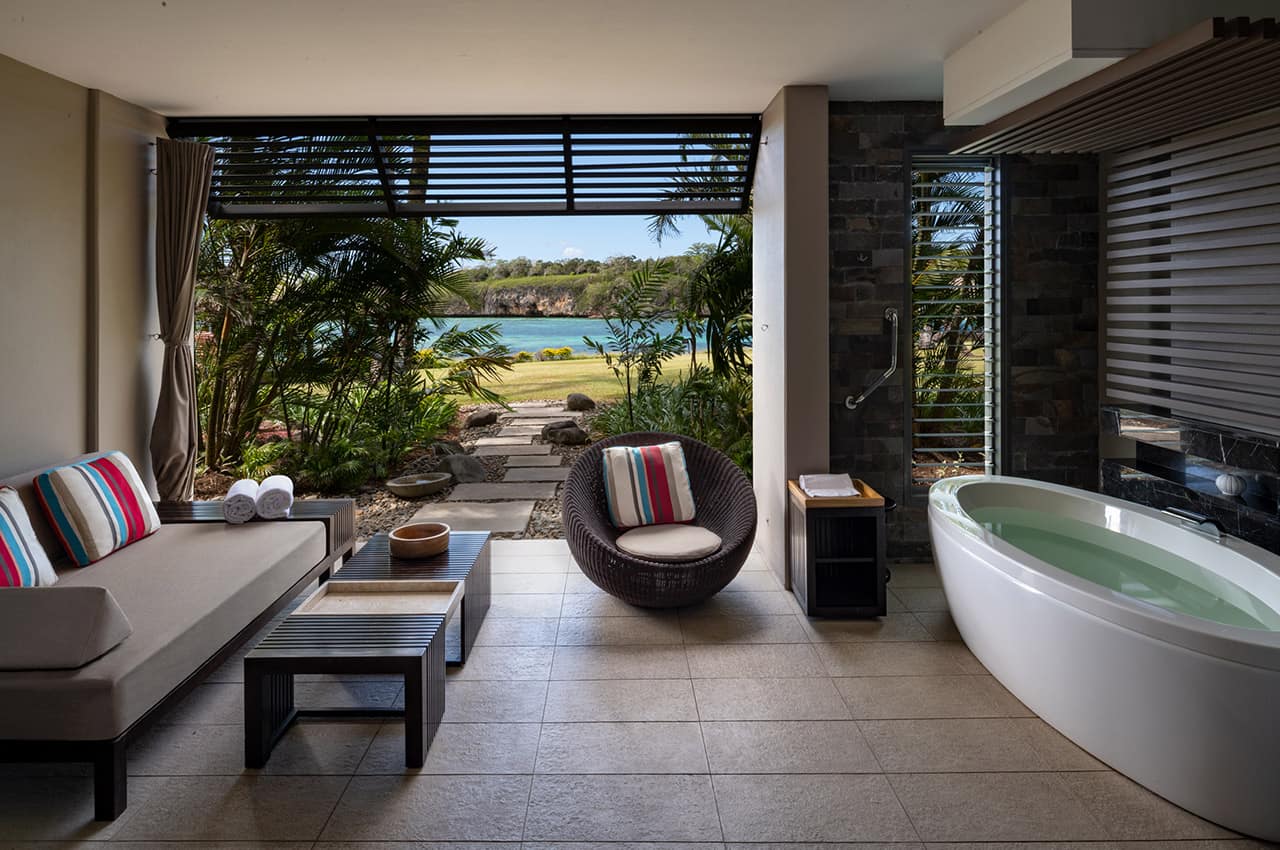 • Acomodação de alto padrão: Escolha entre as acomodações Garden View Room, Lagoon View Room ou Beachfront View Room, todas espaçosas e luxuosas, com terraço privado ou varanda e banho ao ar livre.