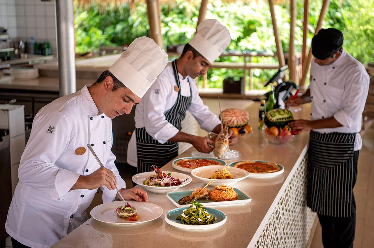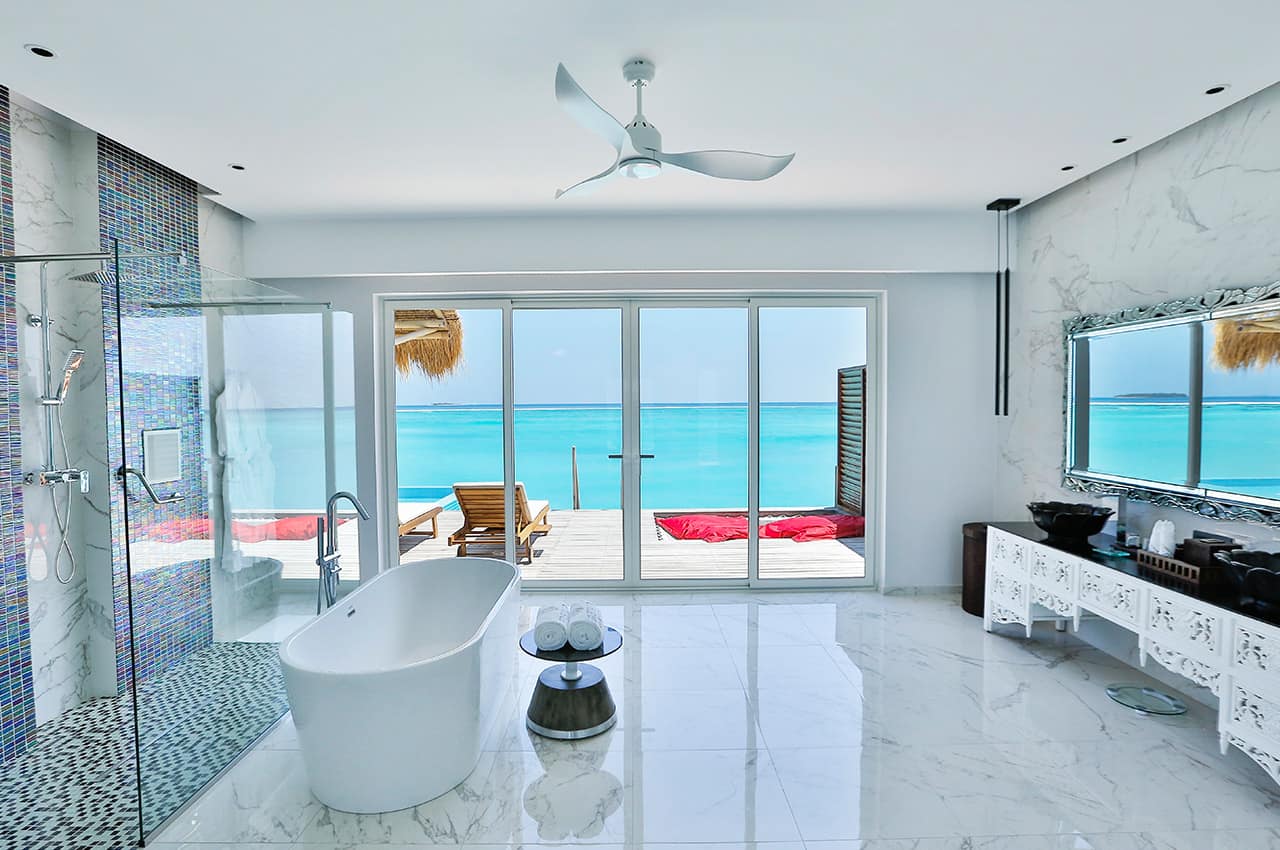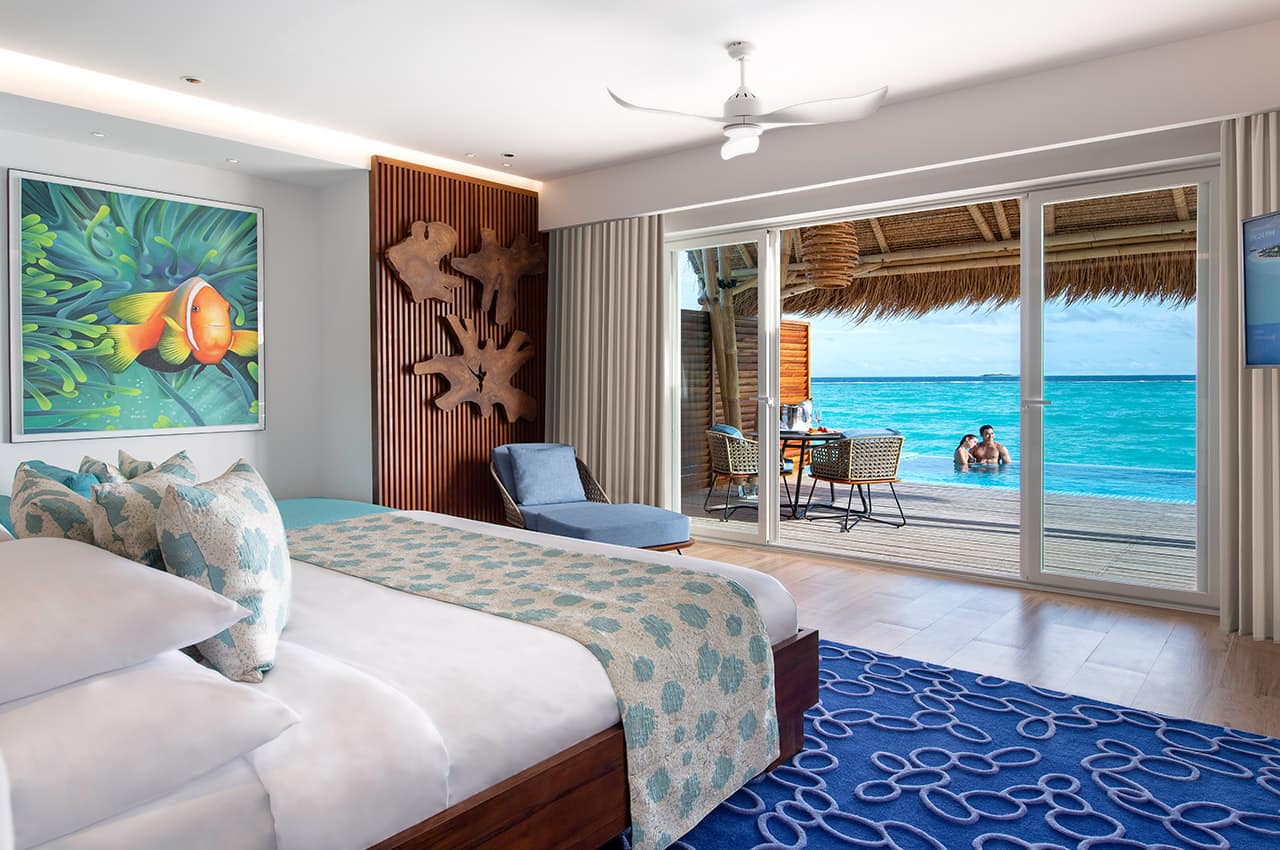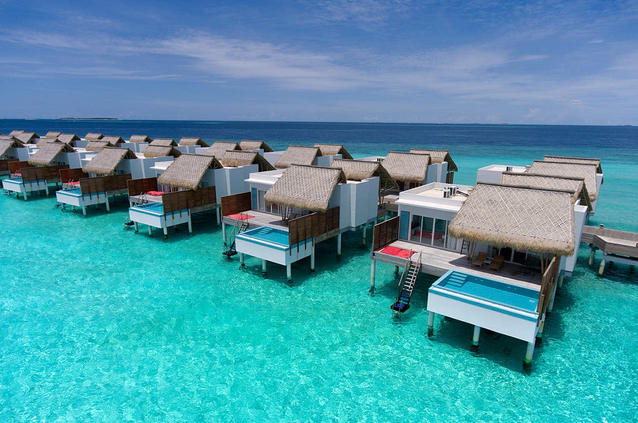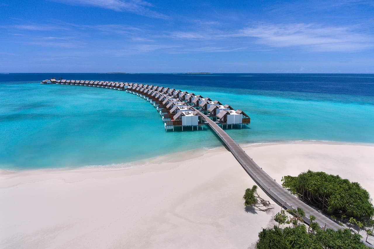 • Acomodação de alto padrão: Hospede-se em villas luxuosas sobre as águas ou em bangalôs na praia, todos com piscina privativa e vista para o Oceano Índico.